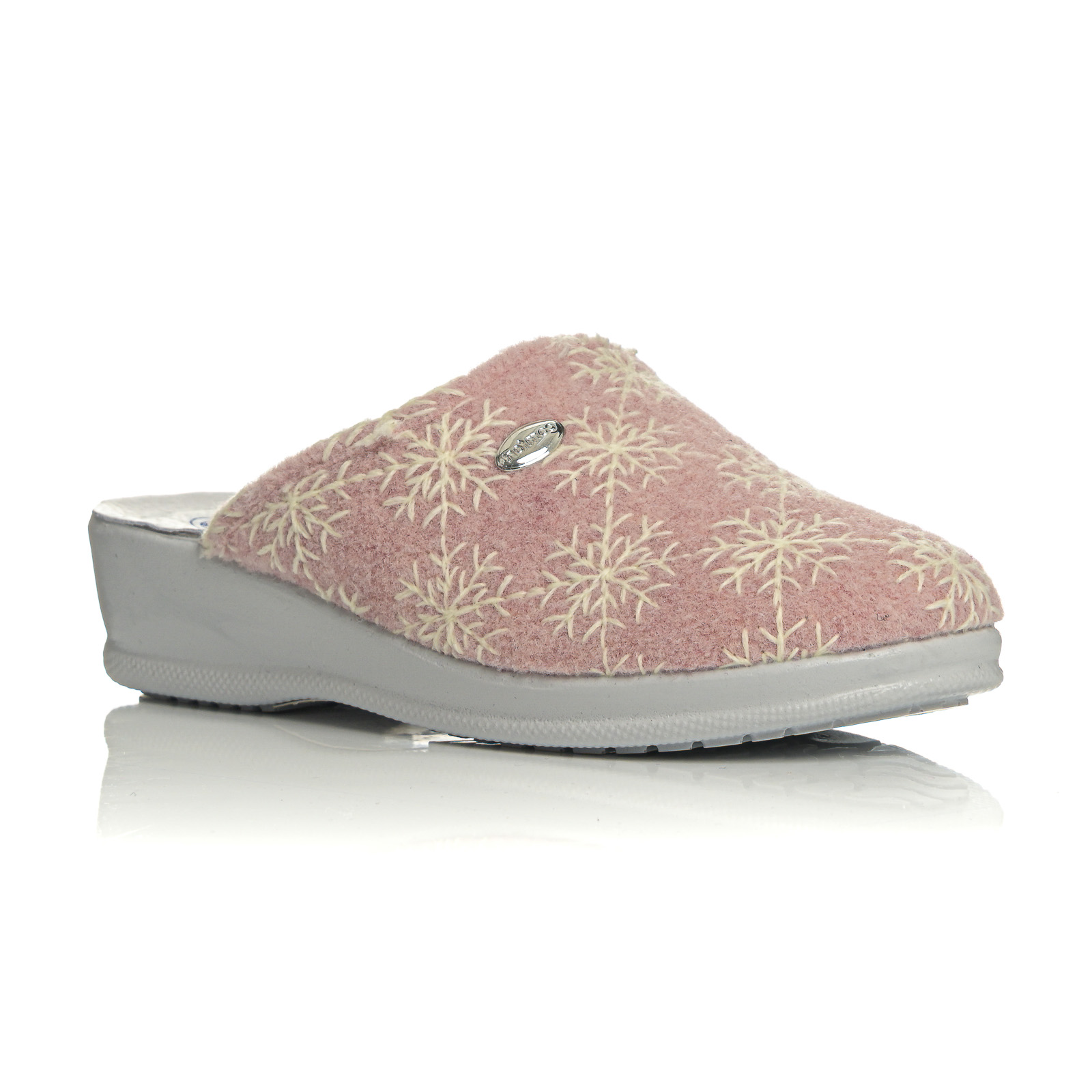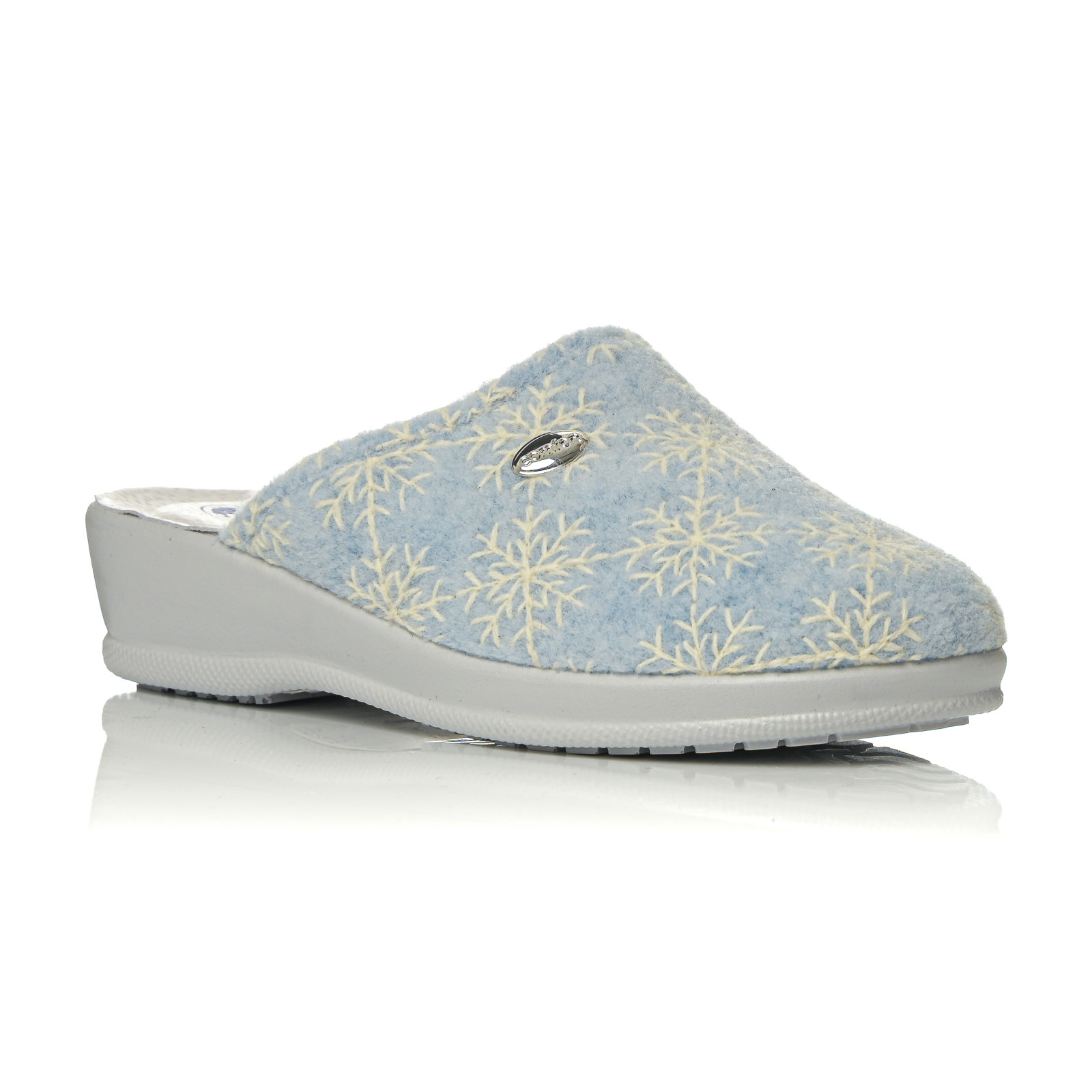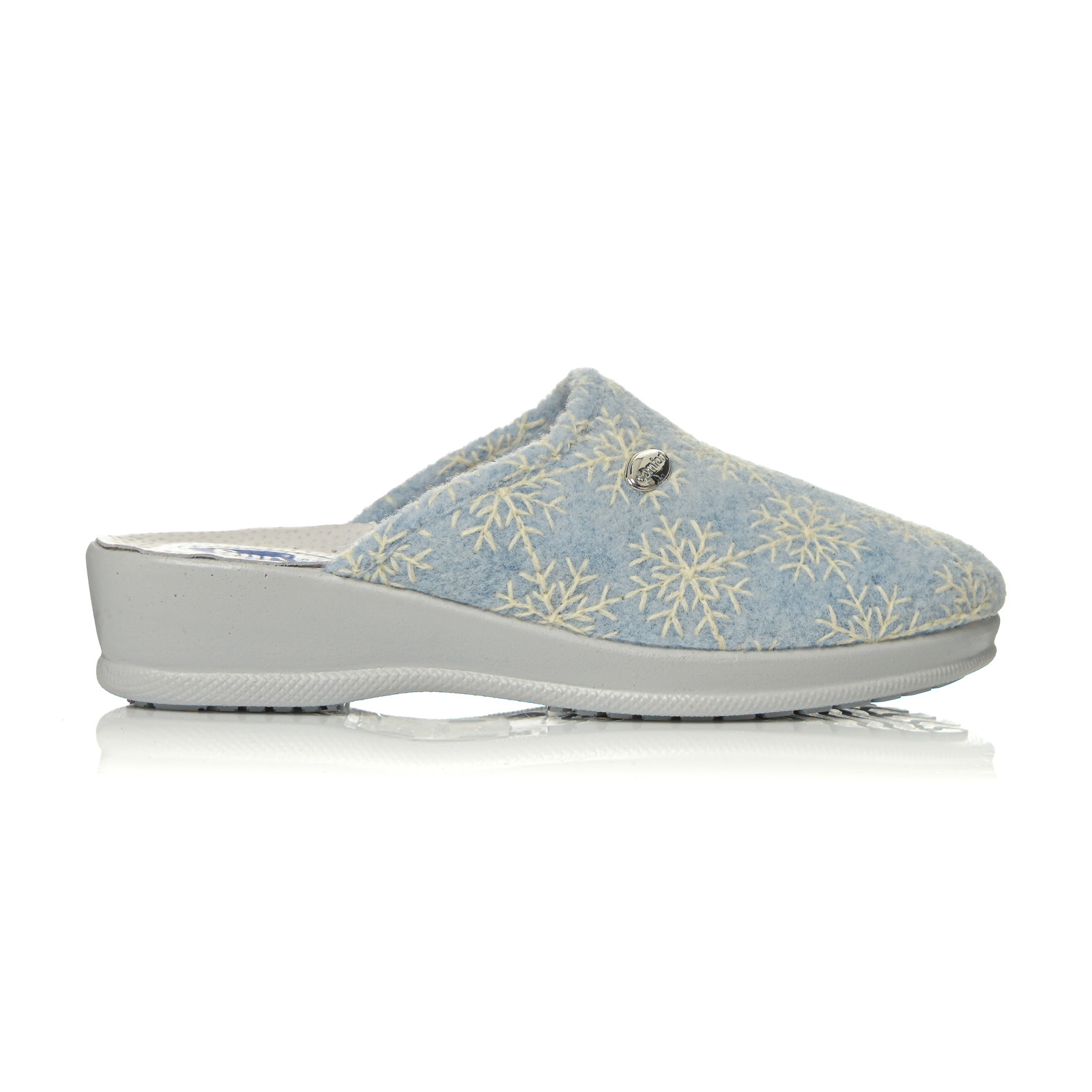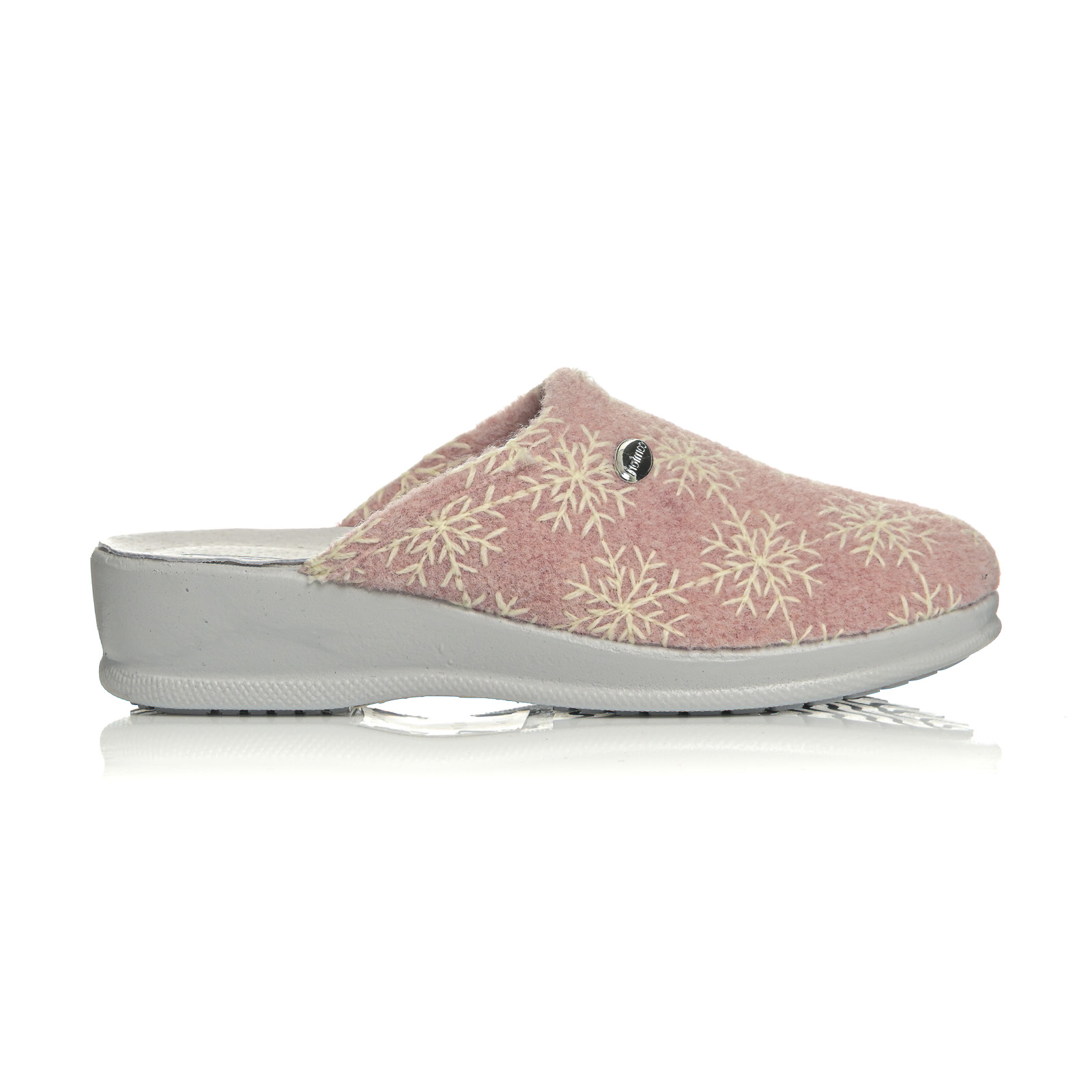 Ανακαλύψτε την απόλυτη άνεση με αυτή τη γυναικεία παντόφλα σε απαλά χρώματα. Διαθέτει μαλακό ύφασμα με κεντητό μοτίβο λουλουδιών/χιoνονιφάδων και διακριτική μεταλλική λεπτομέρεια στο πλάι.