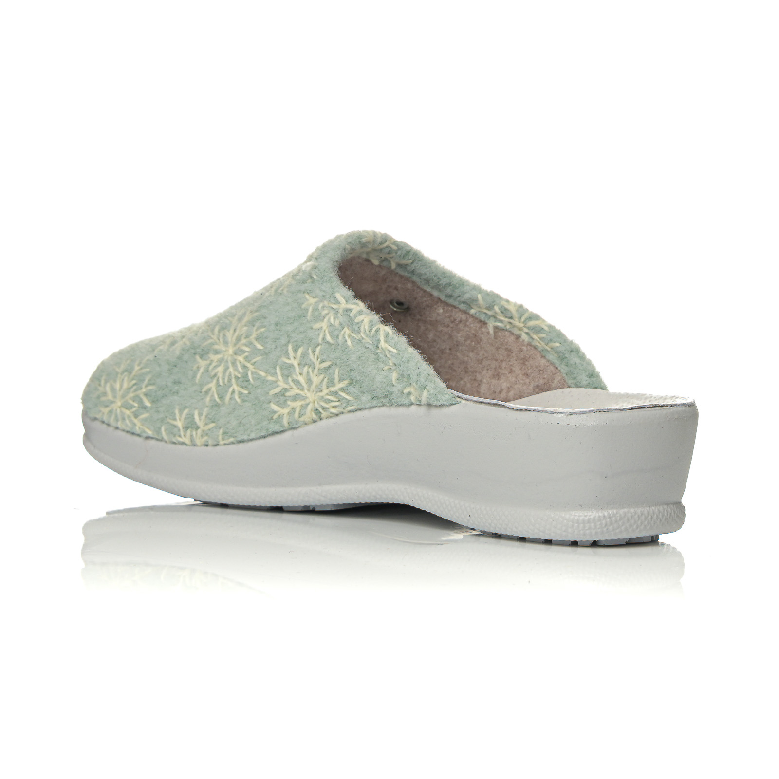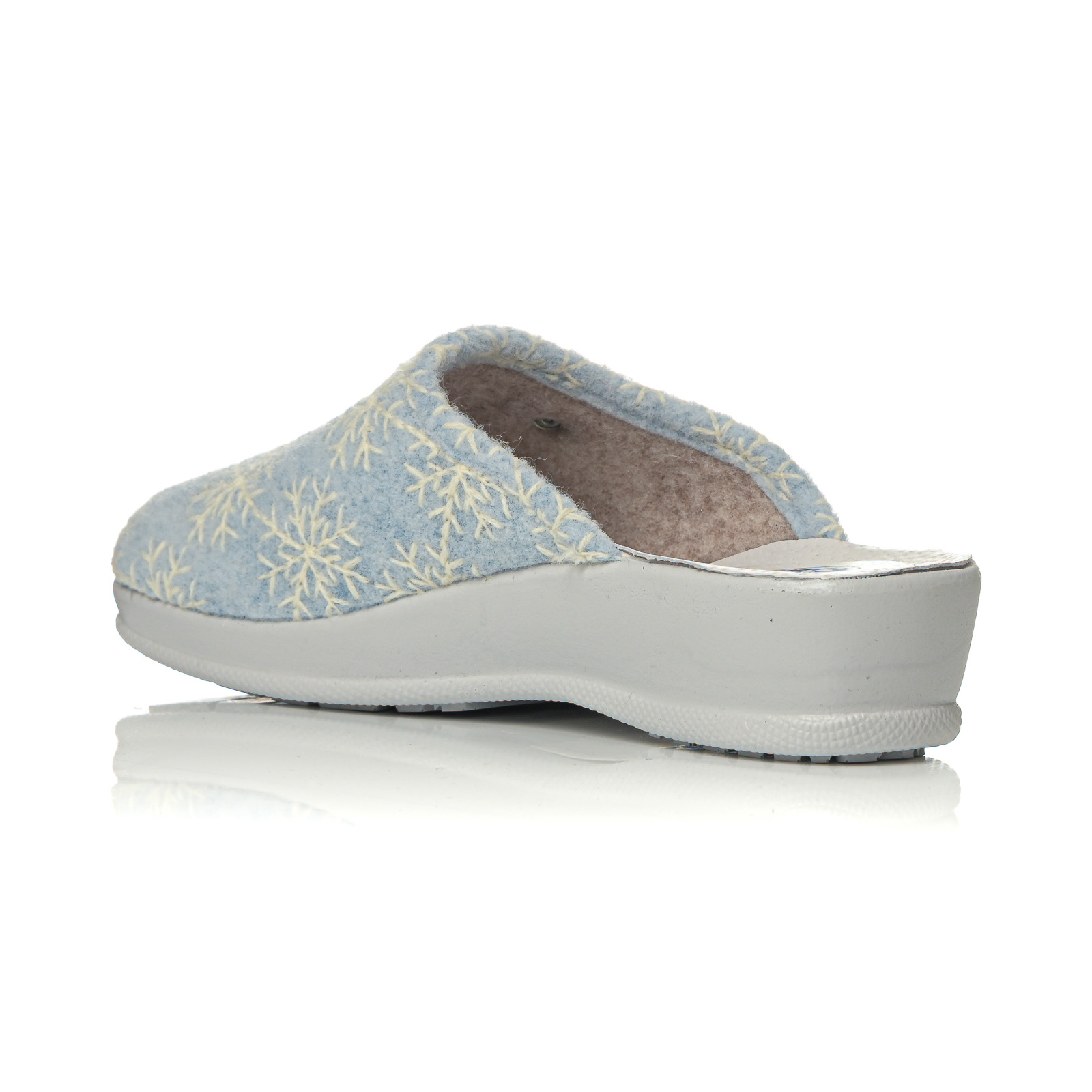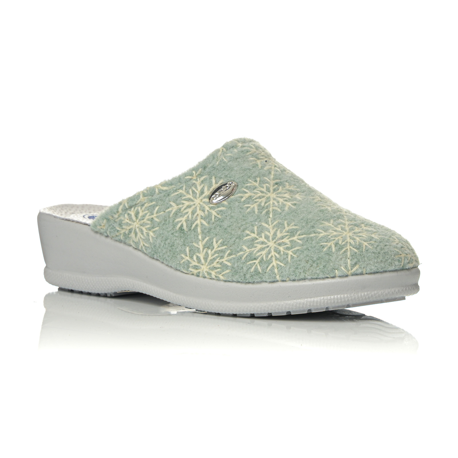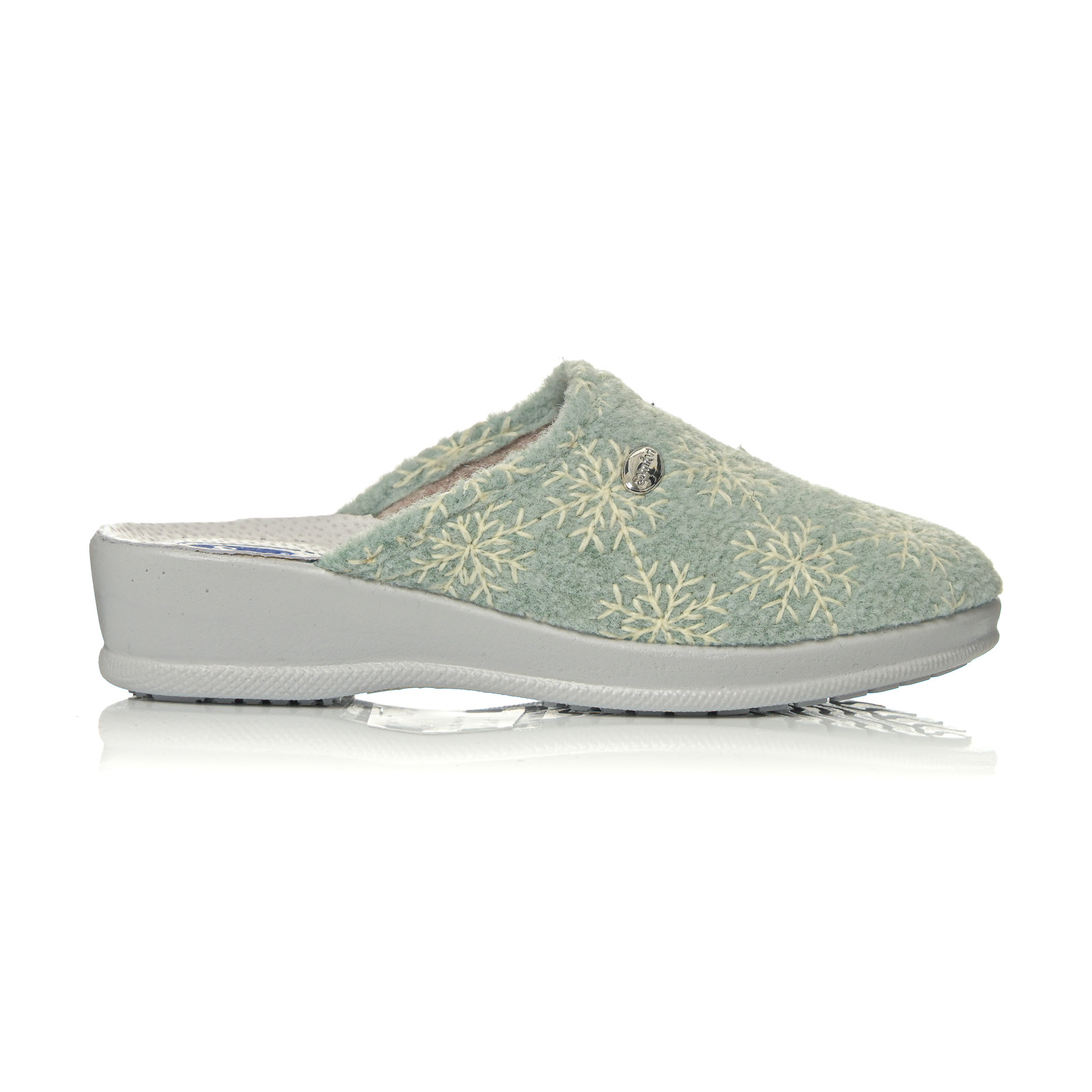 Ανακαλύψτε την απόλυτη άνεση με αυτή τη γυναικεία παντόφλα σε απαλά χρώματα. Διαθέτει μαλακό ύφασμα με κεντητό μοτίβο λουλουδιών/χιoνονιφάδων και διακριτική μεταλλική λεπτομέρεια στο πλάι.