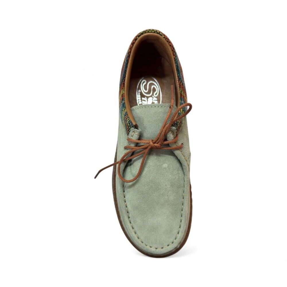 Το επάνω μέρος είναι κατασκευασμένο από απαλό πράσινο σουέντ, ενώ η πολύχρωμη υφασμάτινη λεπτομέρεια γύρω από τον γιακά προσθέτει boho χαρακτήρα και ζωντάνια.