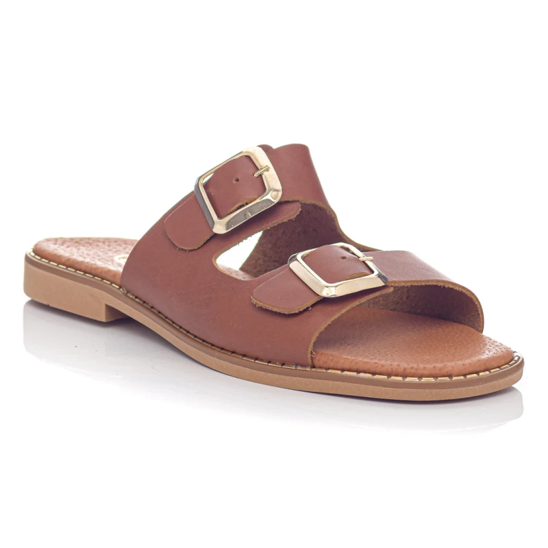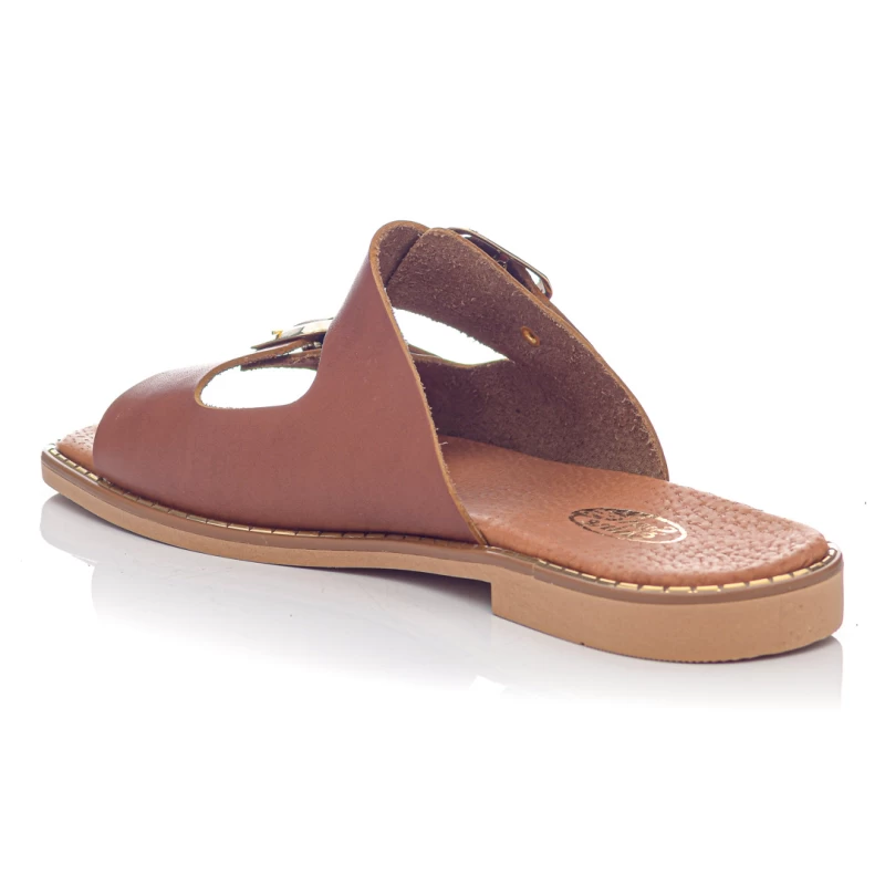 Flat sandals with modern design With studs on the upper side Slip-on design Lightly padded footbed Mini block heel Flexible non-slip sole Form: normal